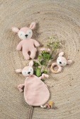 Leuk knuffeldoekje van een hertje. Het gebreide knuffeldoekje is verkrijgbaar in de kleuren groen en roze. Het zachte knuffeldoekje is gemaakt van 100% katoen en de achterkant is gemaakt van terry. Het knuffeldoekje is 20 cm groot.