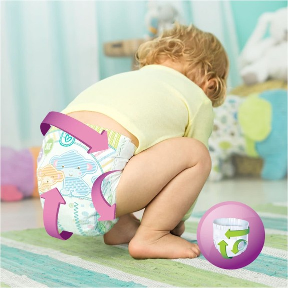 Dankzij de Three-Way Fit sluiten de luiers zich aan rondom het buikje, de beentjes en de billetjes zodat je baby kan bewegen en spelen zoals hij wil.